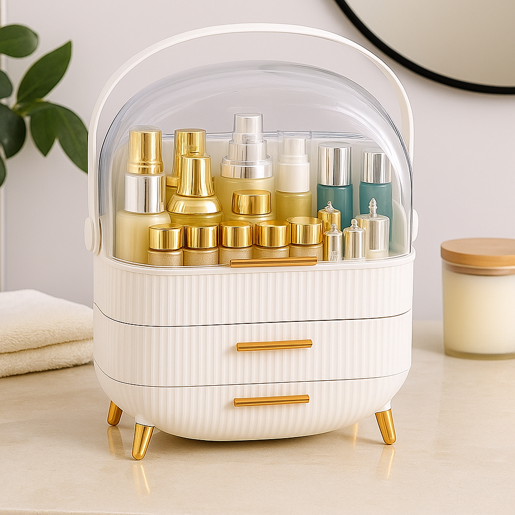 Keep your beauty essentials neat and accessible with this Luxury Portable Cosmetic Organizer Box. Featuring a transparent lid, spacious compartments, and built-in drawers, this elegant organizer is perfect for makeup, skincare products, and toiletries. Its portable design and modern aesthetic make it ideal for your vanity, bathroom, or while traveling. Crafted from durable materials, it helps protect your products from dust and moisture while offering stylish storage.