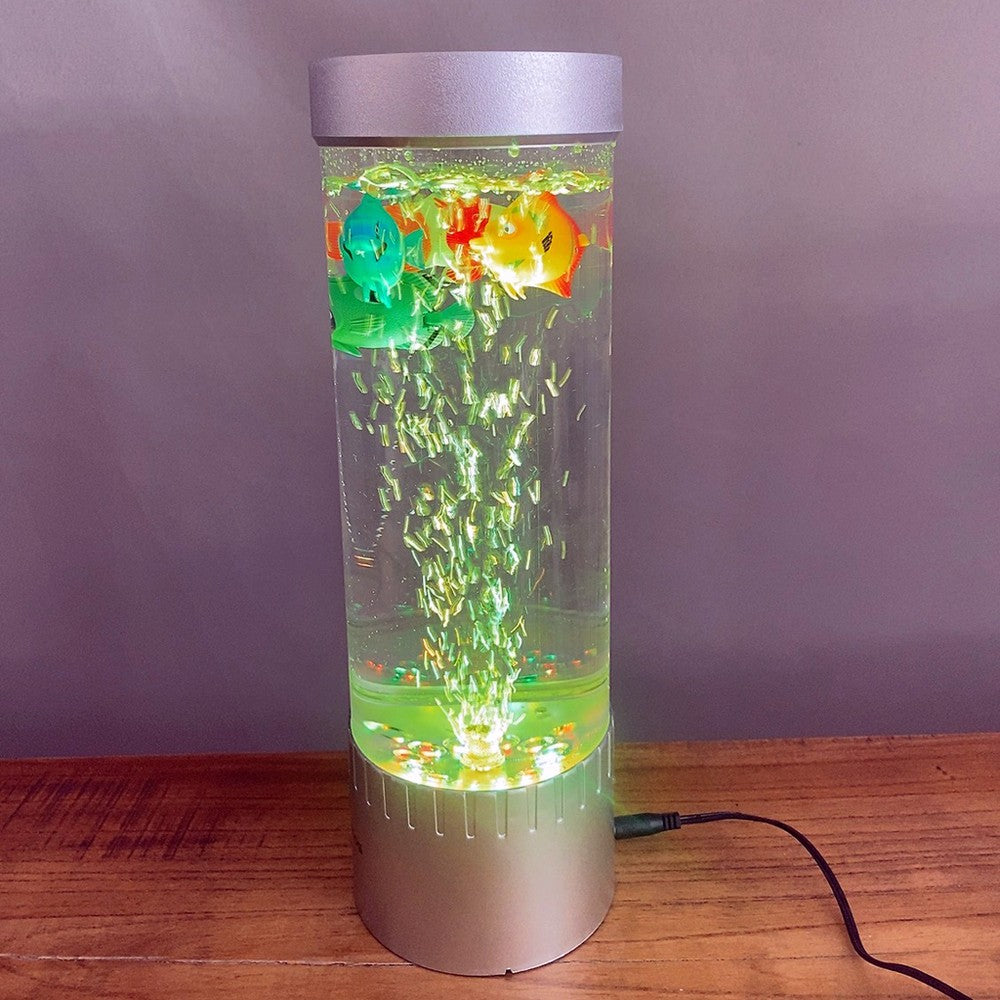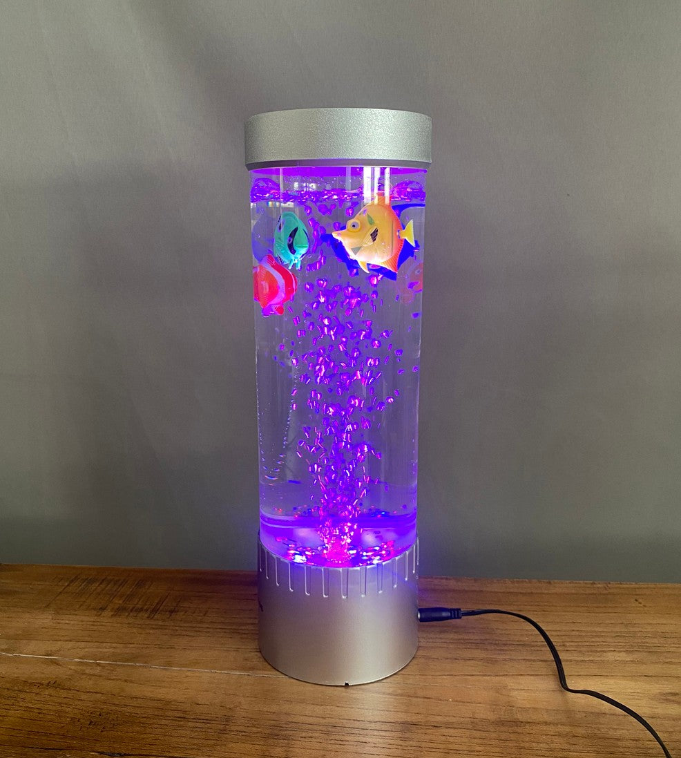 there are three colors of 12PCS LED,(RED,BLUE,GREEN),and can alternately color deterioration ,LED illuminated bubbling water lamps feature bright, multi-colored LED lights that continually rotate and change colors. Our LED lights are rated for 50,000 hours.usually,we put Jellyfish inside . Jellyfish can swimming like real fish,These lighted water lamps are lots of fun, and the included plastic tropic.